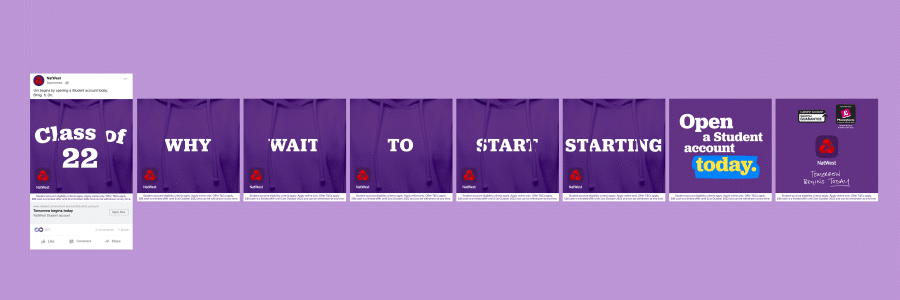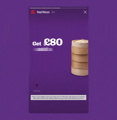 As Lead Designer, I translated this strategy into a unified design system: a bold purple world, consistent across every touchpoint yet flexible enough to carry different messages. From cinematic motion to hyper-targeted UCAS emails, the work fused cultural relevance with strategic rigour — giving NatWest a confident and ownable presence in a cluttered market.